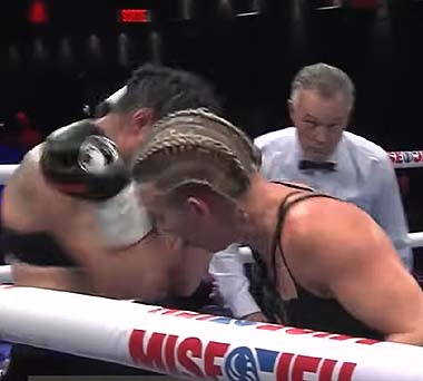 forward behind a stiff jab before crouching low to connect with right hands.