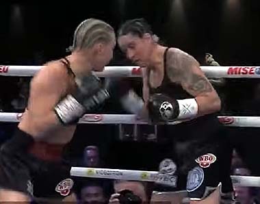 forward behind a stiff jab before crouching low to connect with right hands.